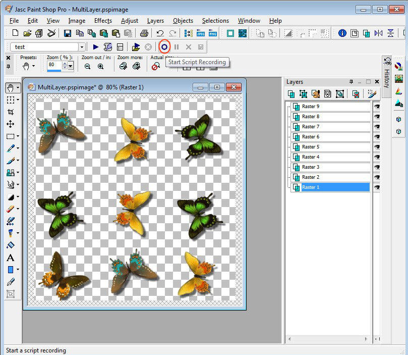For the purpose of this tutorial we will record a simple script that will rename layers and asks the user for the new layer name. You can download a multi-layer pspimage (MultiLayer.pspimage) or you can simply take one of your own. It should have at least four layers. Make sure your Layers palette is visible (View->Palettes->Layers).