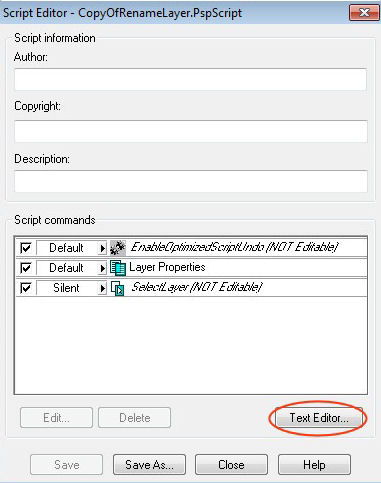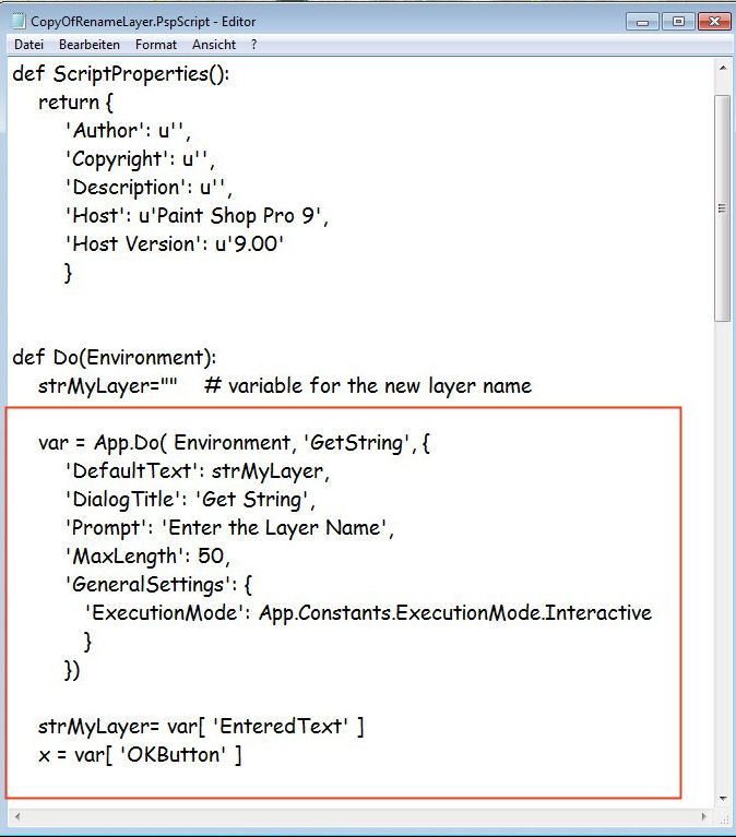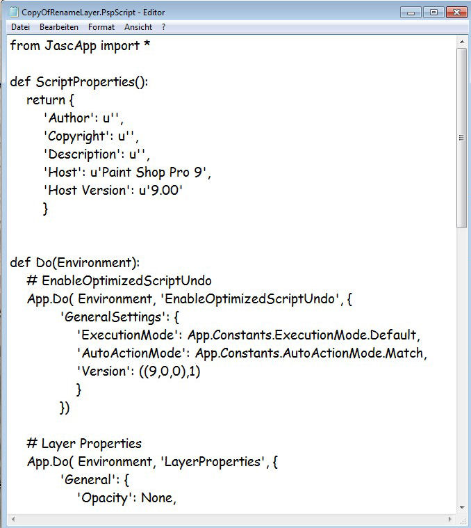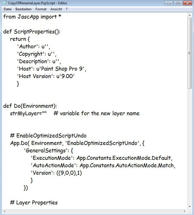 Make sure that you still have the copy of your script selected because now we are going to edit the script heavily. But don't worry, you cannot really do any damage even if something should go wrong. The worst thing that can happen is that PSP will crash on you. But only if you are not careful. Otherwise you can always press escape until the script is stopped.